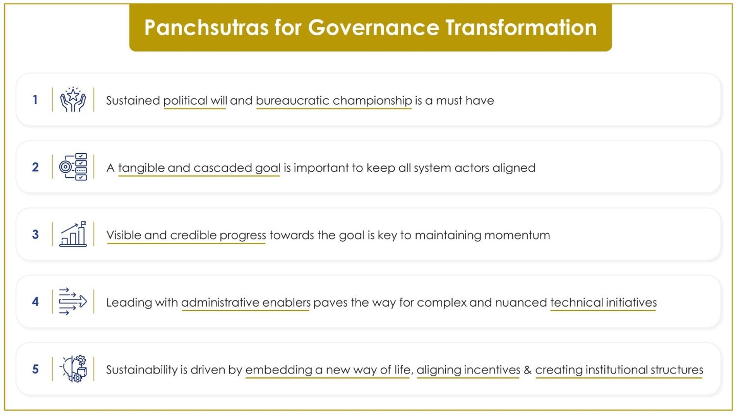 The Panchsutras for Governance Transformation are the five key principles for carrying out a successful governance transformation at the national, state or local government level.