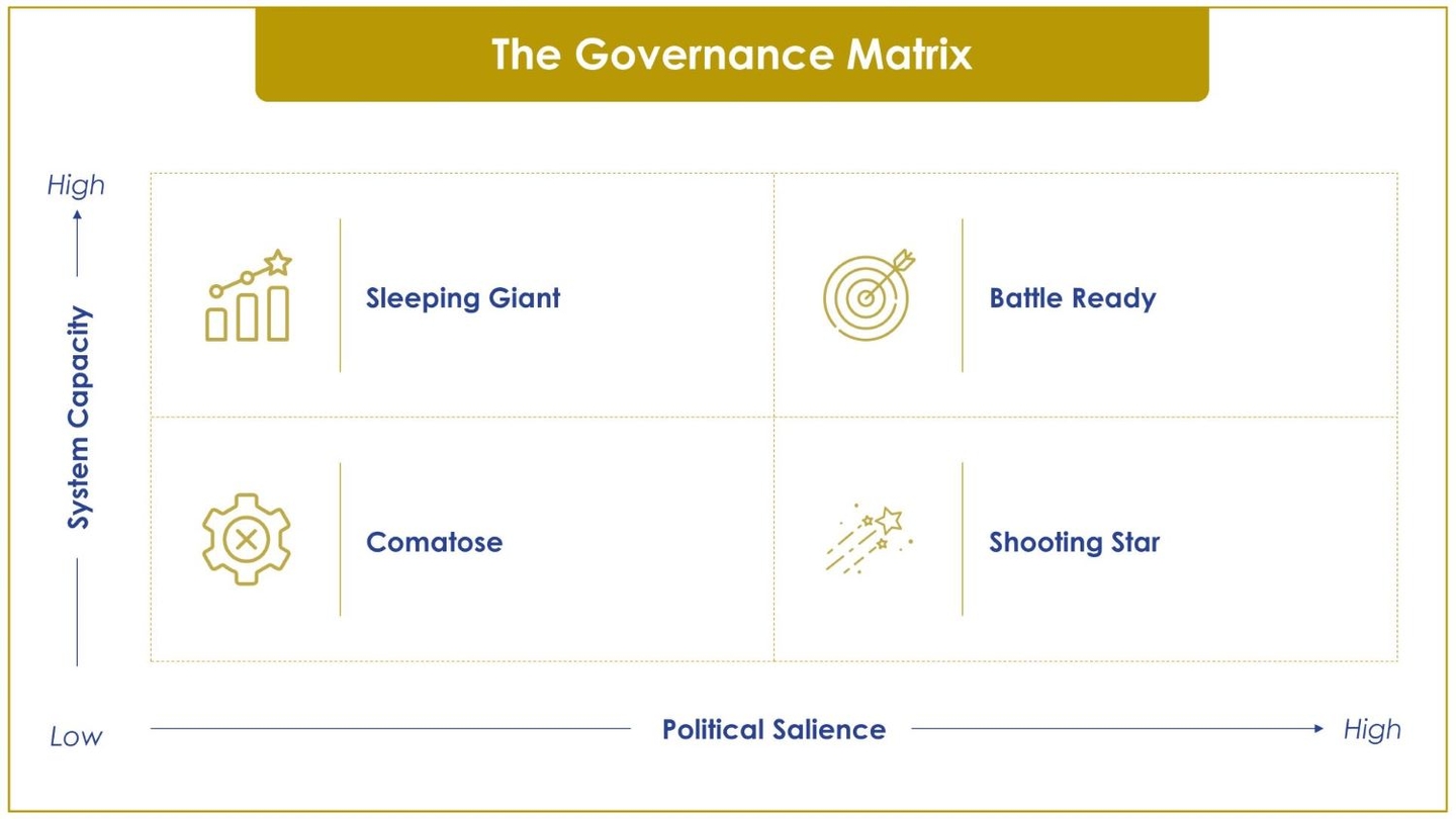 The Governance Matrix is a tool to determine the readiness of a government (national, state or local) to drive outcomes as a function of political salience (political will) and system capacity (people, processes and infrastructure).